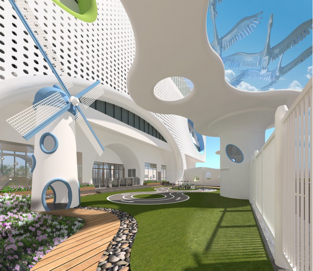 本案設(shè)計(jì)師運(yùn)用豐富的設(shè)計(jì)語言與理念,從多個(gè)維度對幼兒園進(jìn)行全方位的立體設(shè)計(jì),溫馨:幼兒園是孩子的第二個(gè)家,園舍柔和的色彩、適齡的布置都會減少幼兒入園焦慮,給幼兒以安全、溫馨的滿足感。藝術(shù):富有藝術(shù)的環(huán)境創(chuàng)設(shè),可以培養(yǎng)幼兒欣賞美、感受美、和創(chuàng)造美的能力,并能陶冶幼兒的情操。自主:幼兒園是孩子的天地,是孩子的樂園,是孩子自己的家,幼兒園的環(huán)境創(chuàng)設(shè)應(yīng)體現(xiàn)孩子的自主性。生態(tài):根據(jù)幼兒好奇、好動(dòng)、好模仿的特點(diǎn),創(chuàng)造良好的生態(tài)環(huán)境,發(fā)揮境教的功能,有利于幼兒身心健康和諧發(fā)展。建立戲水池、仿沙灘、種植園、草坡、風(fēng)車、水族館、科學(xué)館、動(dòng)物等,營造鳥語花香、綠色盎然的天然景觀,讓孩子在觀察中發(fā)現(xiàn),在活動(dòng)中感知,在創(chuàng)造中想象,在動(dòng)手參與飼養(yǎng)、種植等勞動(dòng)中懂得保護(hù)環(huán)境,愛護(hù)大自。